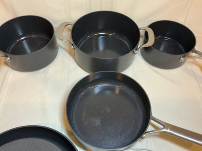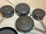 A collection of OXO nonstick frying pans and saucepans with metal handles, the pots have glass lids. Excellent condition.