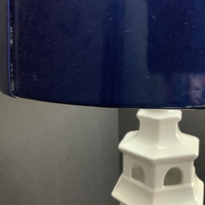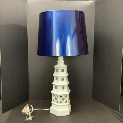 White ceramic pagoda base in lighthouse shape, with unique small bulb, electric blue shade has seam coming loose, made in China. 22.5h base, 15.5d shade, 29.5 overall. Works. 1 piece.
