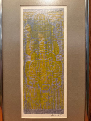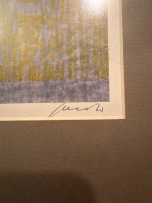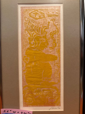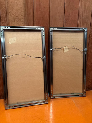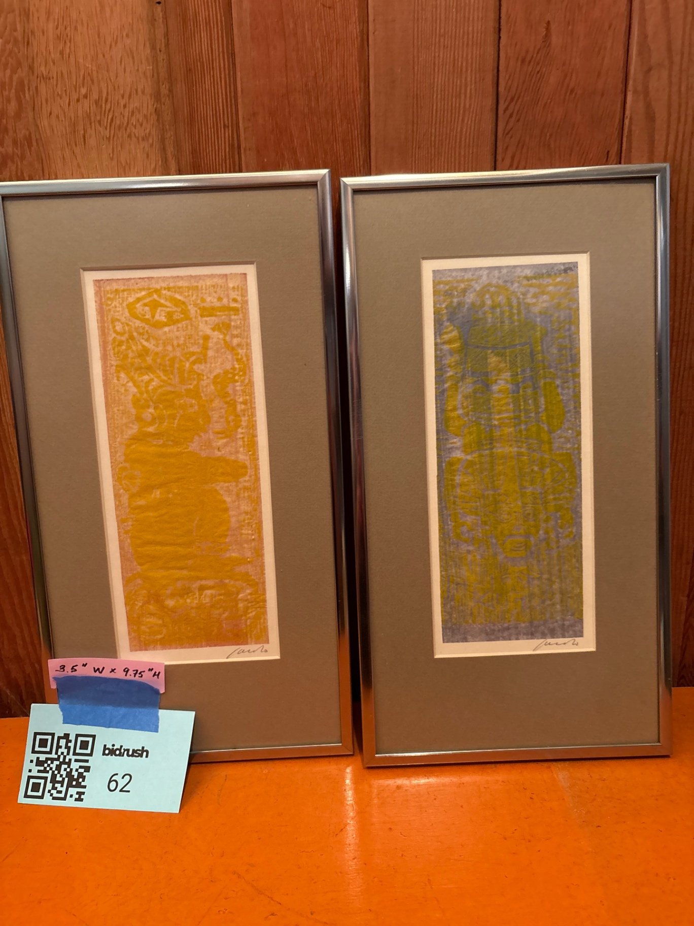 Two vertical framed block art paintings, signed & each mounted with mat and a metal frame; both prints are signed at the bottom edge. Dimensions are 3.5” x 9.75”
