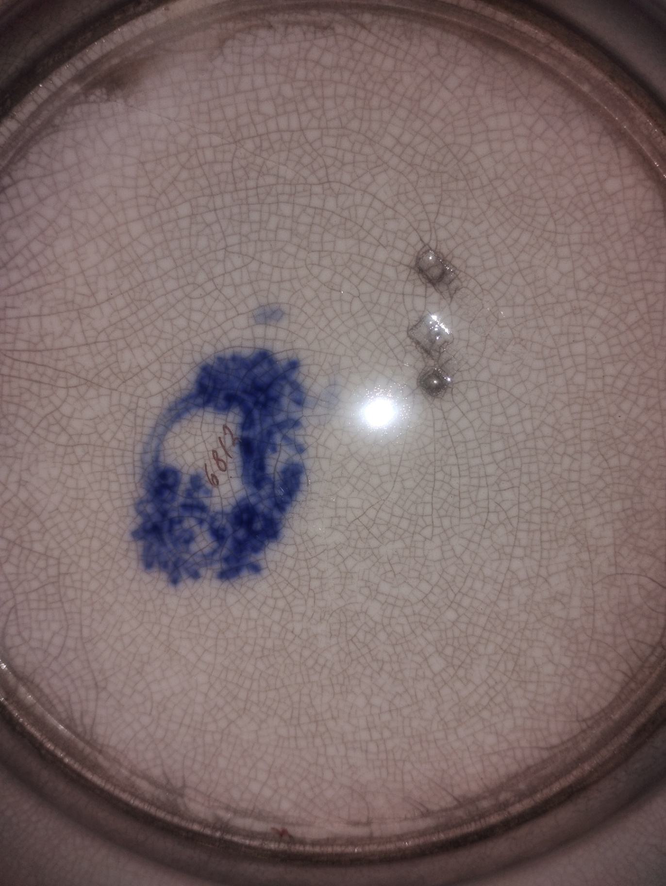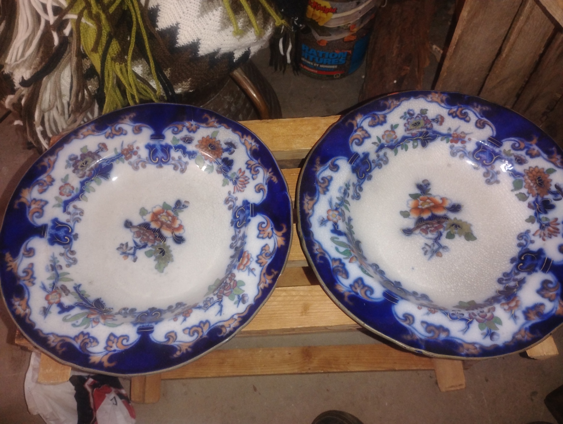 Two decorative porcelain plates with cobalt blue ornate borders and central floral motifs; underside shows a crackled glaze and a blue maker's mark.