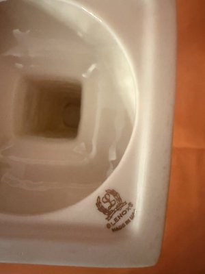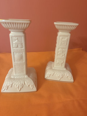A matching pair of white Lenox porcelain candlestick holders featuring decorative raised panels, fluted candle cups, and a leaf-pattern base; each stand is approximately 7 inches tall.