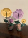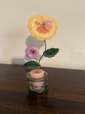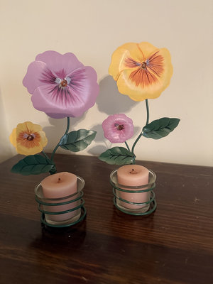 Two decorative metal flower candle holders with glass cups and pink candles, featuring yellow and purple blossoms, green leaves, and coiled stems.