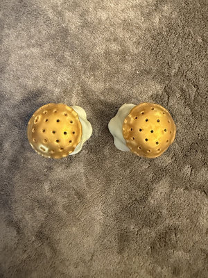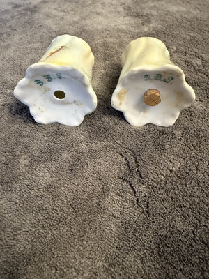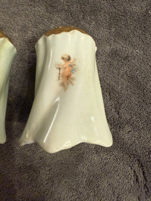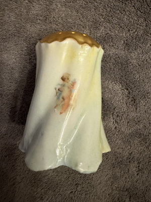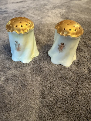 Two vintage porcelain salt and pepper shakers with a pale glaze, gold-toned perforated caps, and hand-painted cherub motifs; bases bear green maker marks and cork stoppers are present on at least one.