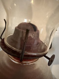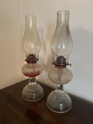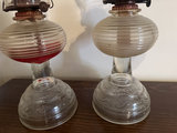 A pair of hurricane-style glass oil lamps with clear chimneys, ribbed glass bodies, and etched bases; both feature metal burner assemblies and wicks, with one lamp showing a red-tinted lower globe. Approx 17"
