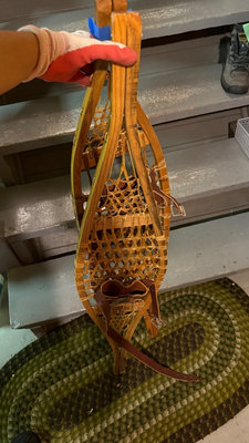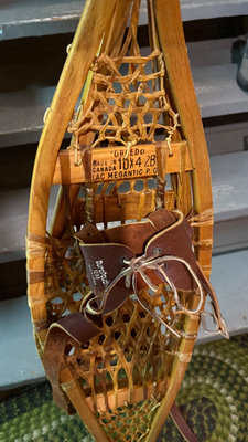 A pair of wooden snowshoes with woven lattice webbing and leather bindings, including leather ankle straps and metal hardware.
