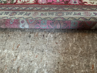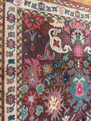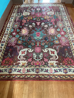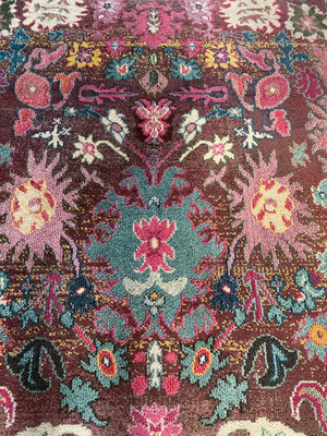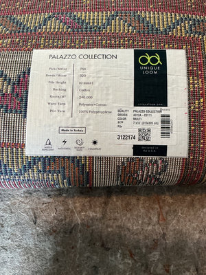 A large, multicolored oriental-style area rug featuring burgundy, teal, pink, and cream floral motifs with a decorative border. The rug is labeled Palazzo Collection by Unique Loom and notes it is made in Turkey. 7’ x 10’