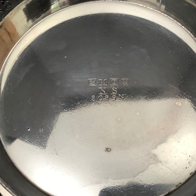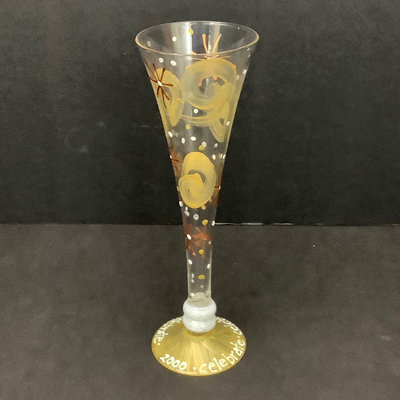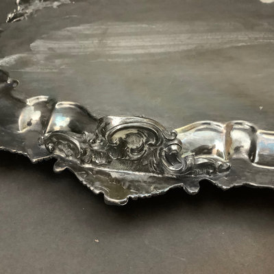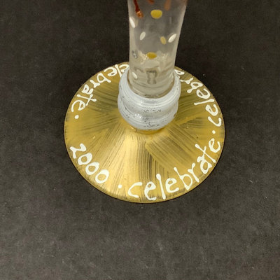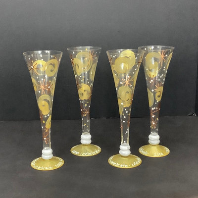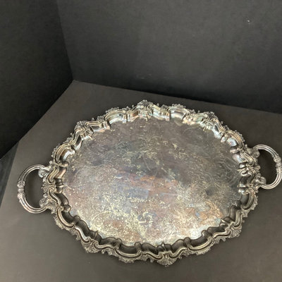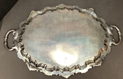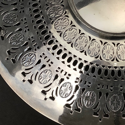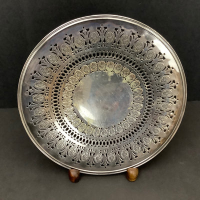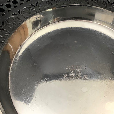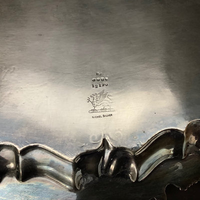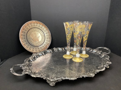 Set of hand painted champagne flutes, dated 2000 on the stem. Large footed serving tray, EPNS nickel silver, griffin maker's mark, 27x22. Wallingford Co. no. 3089N reticulated charger plate, stamped NS for nickel silver, 10d. 6 pieces.