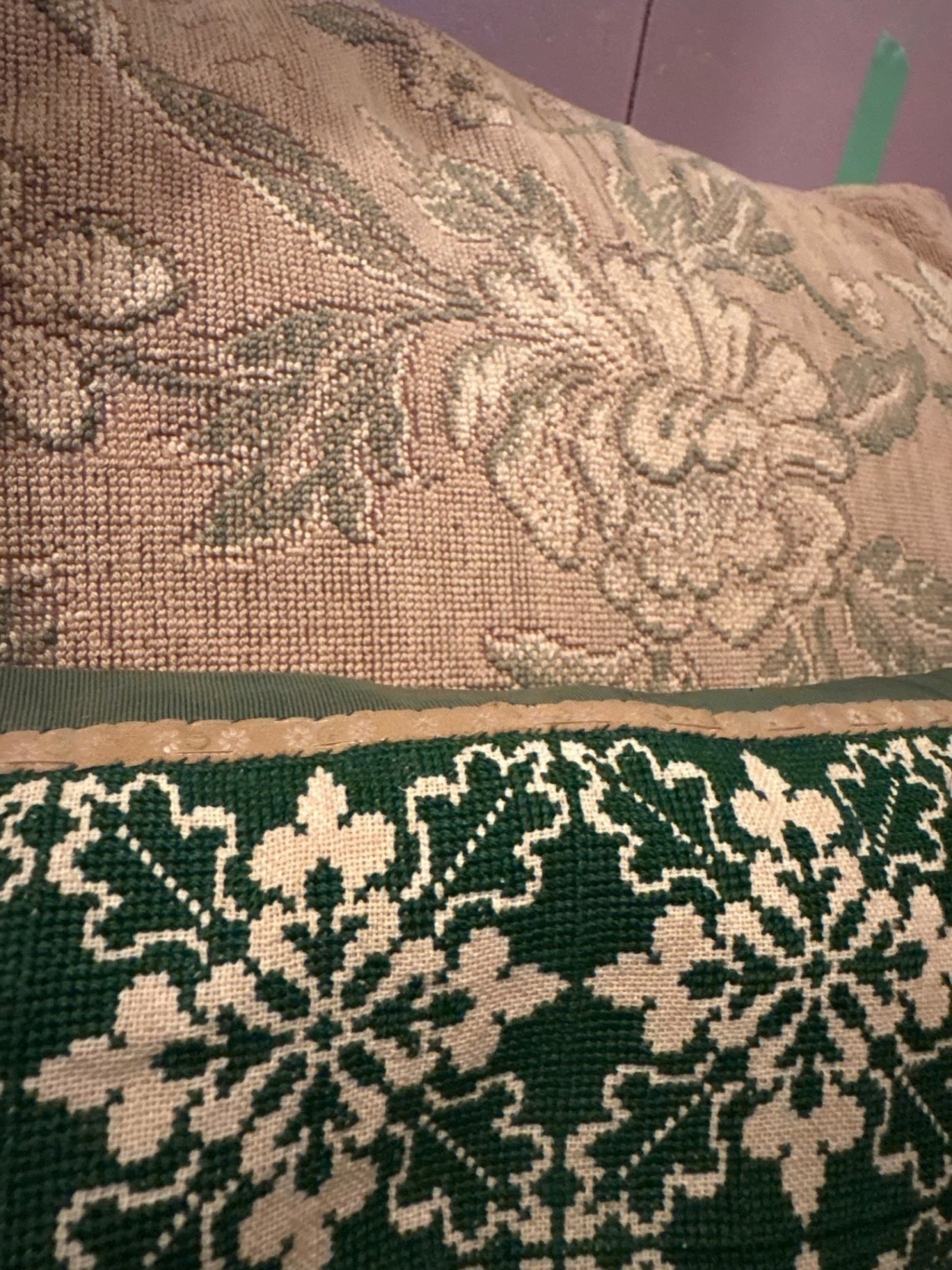 A collection of textile items including a large multicolor patchwork quilt 80x90", several decorative cushions with floral and damask patterns, and an red/orange blanket.