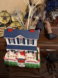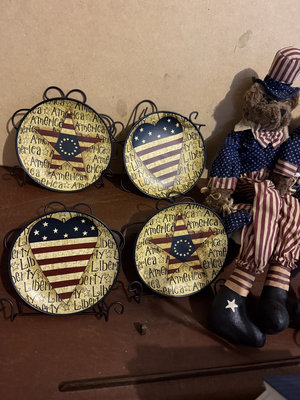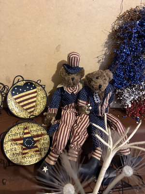 A collection of patriotic-themed decorative items including round metal plates with star and stripe motifs, two teddy bear figures dressed in red, white, and blue outfits, a multicolored bead wreath in red, white, and blue, and a small American-style house figure with bunting and porch details.
