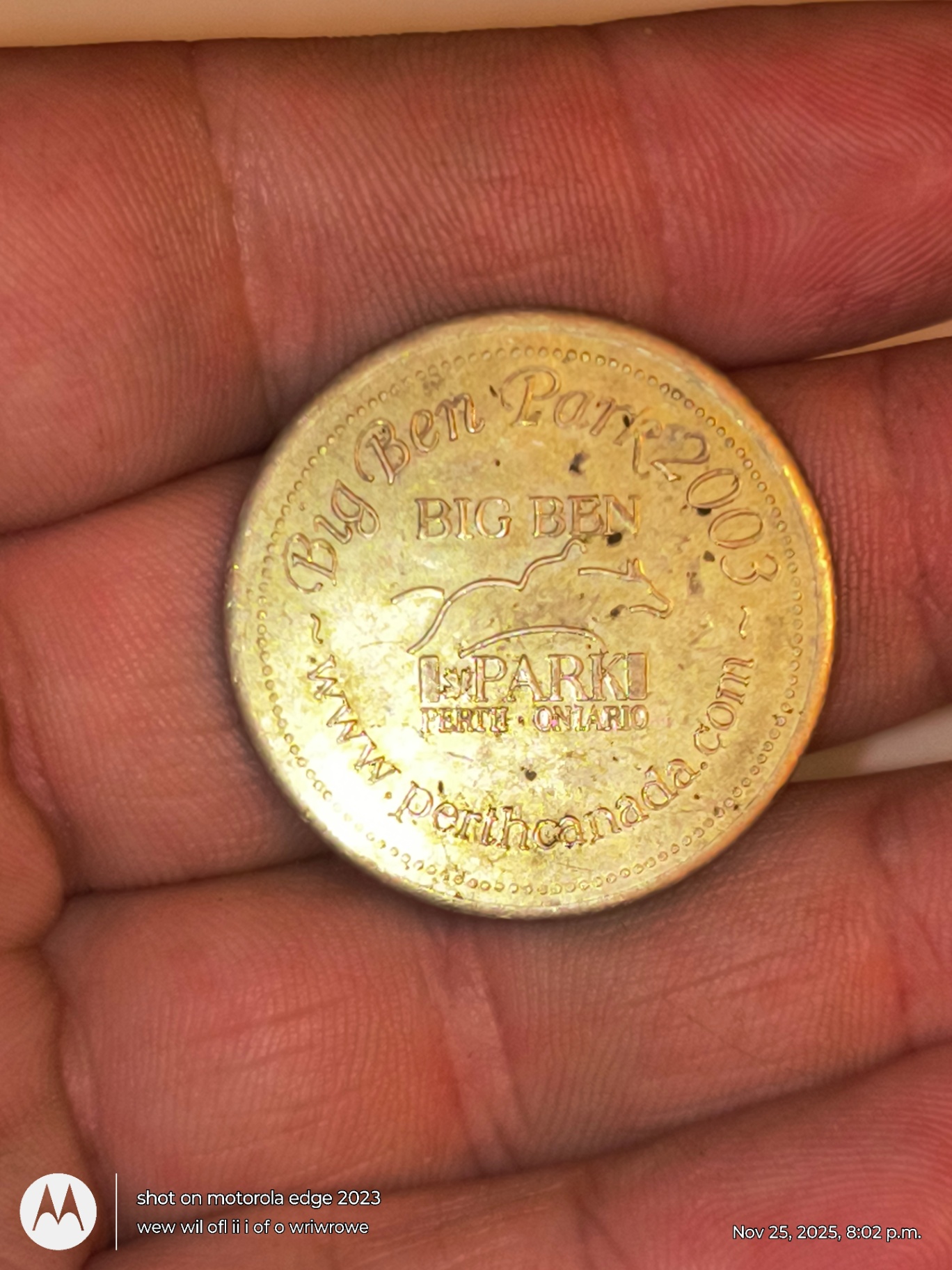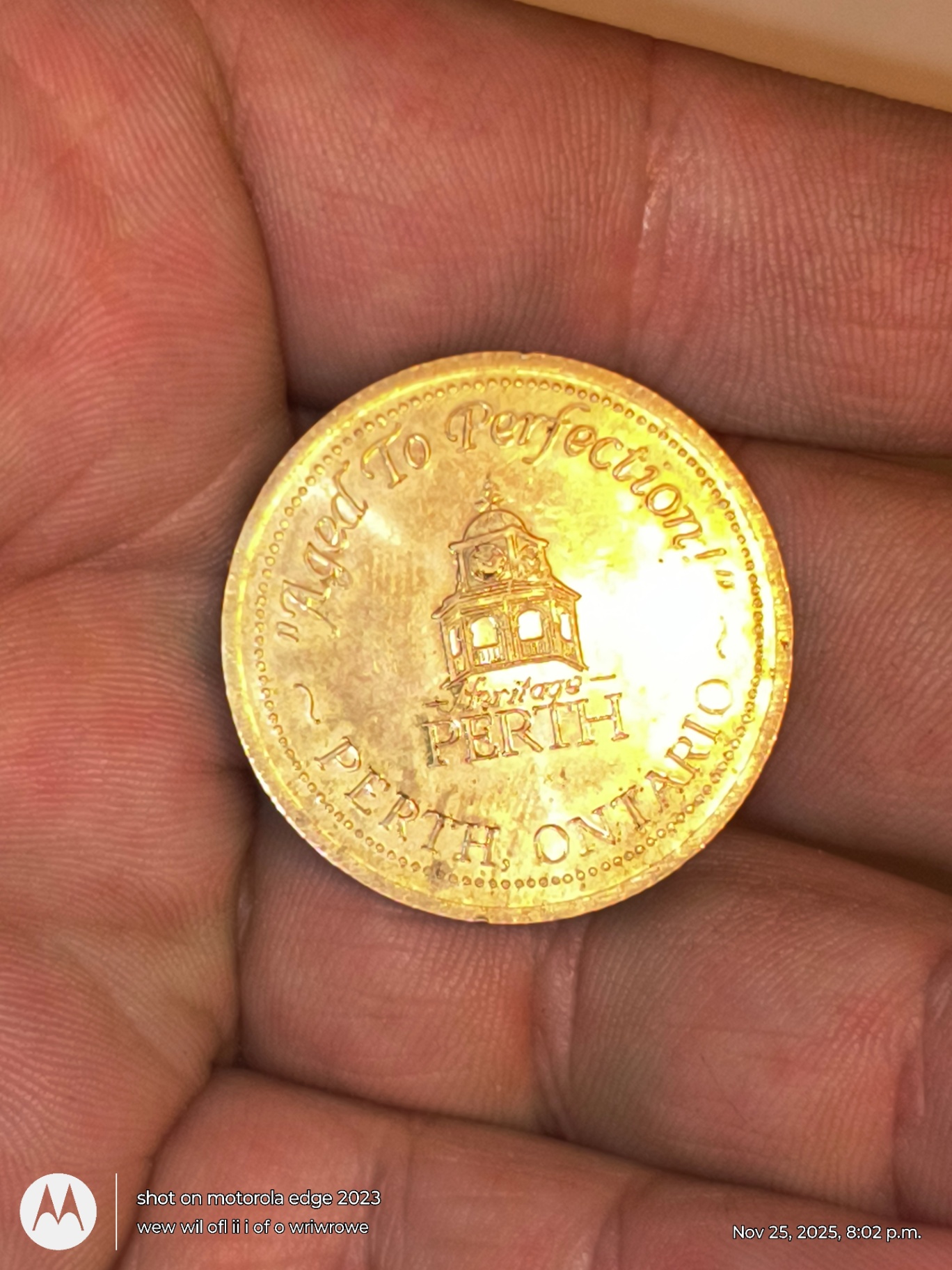 Gold-colored commemorative coin from Perth, Ontario, featuring a Big Ben motif and the words 'Perth Ontario' on one side, and a clock tower illustration with 'Heritage Perth' on the other.