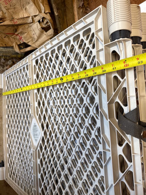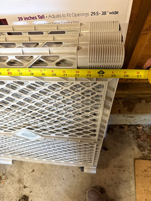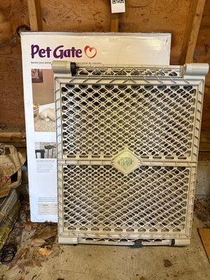Three-panel foldable pet gate with lattice-style panels. Height about 25.5 inches and adjustable width at 32 per panel. Packaging labeled 'Pet Gate' for a different item is present. Located in garage.