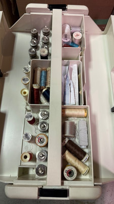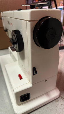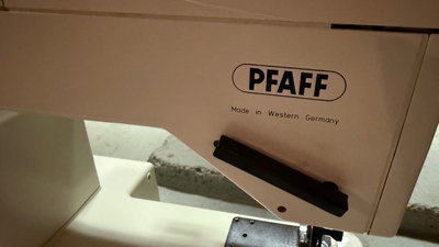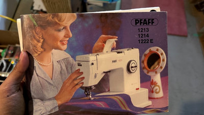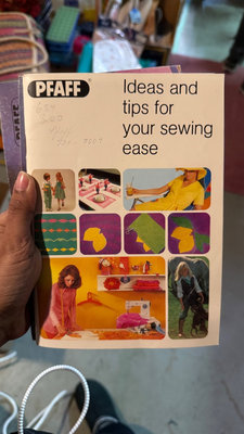 A vintage Pfaff sewing machine with accessory tray filled with spools of thread and sewing supplies, along with a Pfaff instruction booklet titled 'Ideas and tips for your sewing ease'. Cover included *Higher quality machine not used in awhile and will need some servicing.