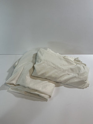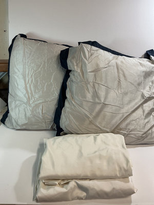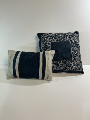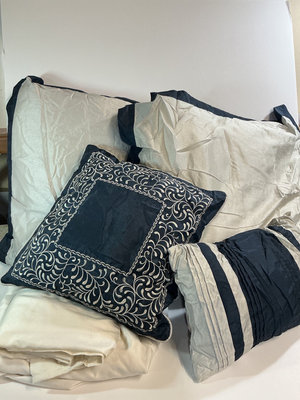 Assorted pillows and bedding items in cream and navy, including embroidered decorative cushions, striped pillow covers, cream colored top and fitted sheet missing pillow cases.