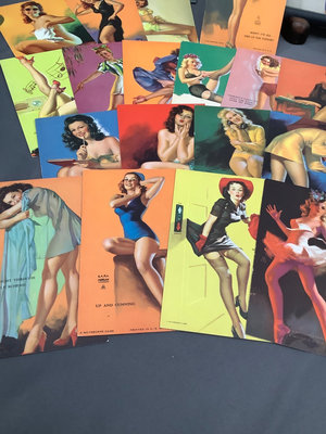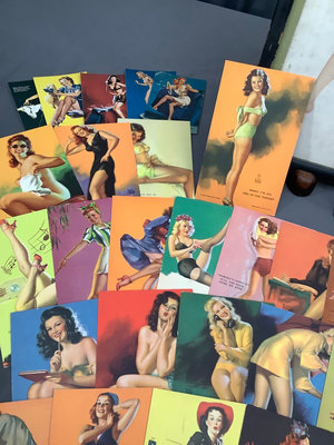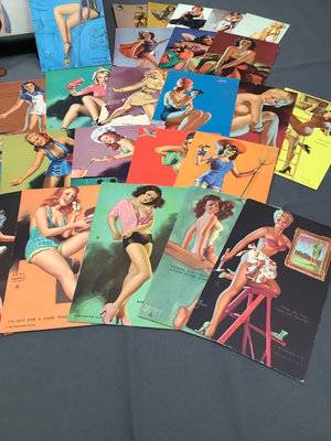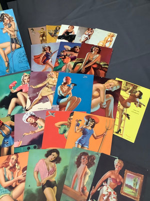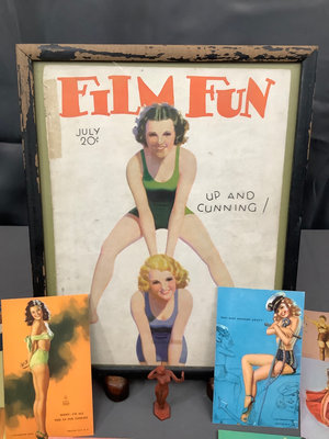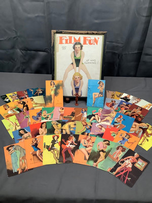 Vintage pin-up cards from artists, Earl Moran, Art Frahm by Mutoscope, 3x5 and 3x4. Film Fun poster measures 9x12. Tiny metal pinup figurine. 40 plus pieces.