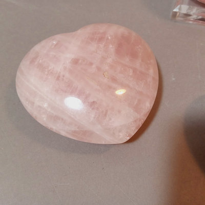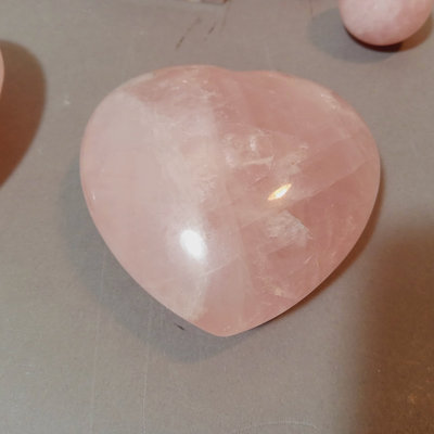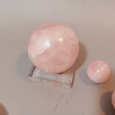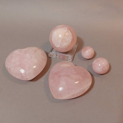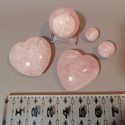 Large Pink Quartz hearts, 3.25x3.5 at 9oz, and 3x3 at 7.32 oz. Large sphere with stand, 2.25d at 7.63oz. 1.25d and 1d spheres. 6 pieces.