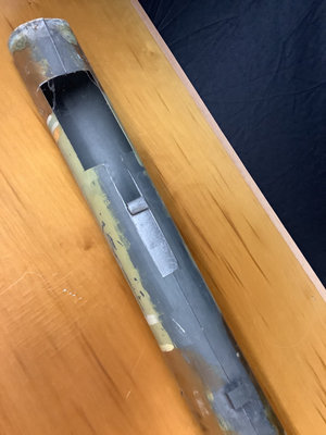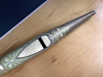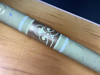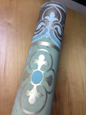 Galvanized metal pipe from a large wind driven pipe organ, ornate paint showing wear. 6d x 77h (6ft 5in). one long piece, bring appropriate vehicle to pickup. 1 piece.