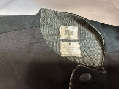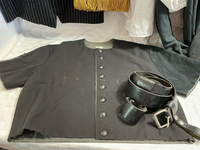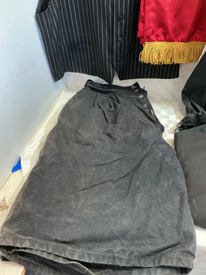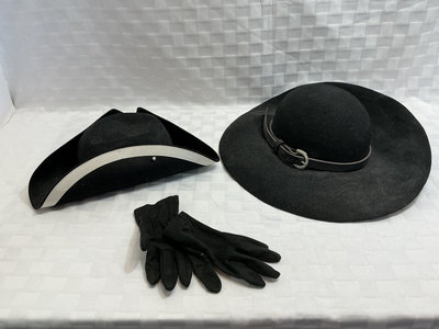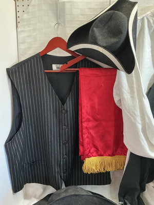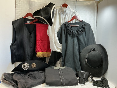 A collection of period-appropriate clothing and accessories including a pin-striped waistcoat, white blouse, black cape, red sash with gold fringe, a black wide-brim hat and two tricorn hats, a black belt with buckle, black gloves, and decorative brooches.