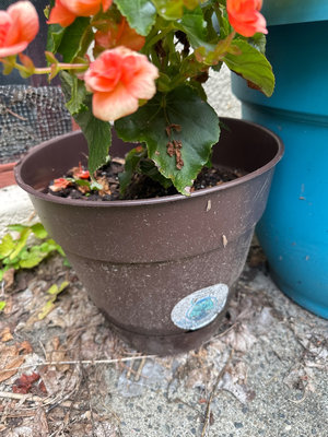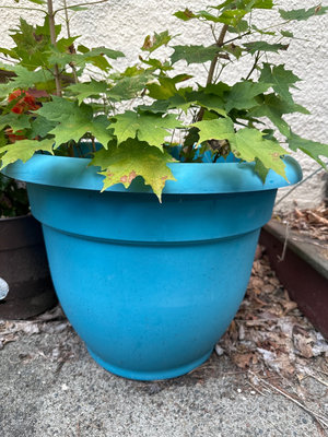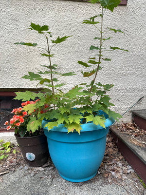 Blue plastic planter contains tall, lobed-leaf saplings resembling a young mulberry tree; a brown pot nearby holds orange begonia flowers. Outdoor plants in good condition at time of cataloging.