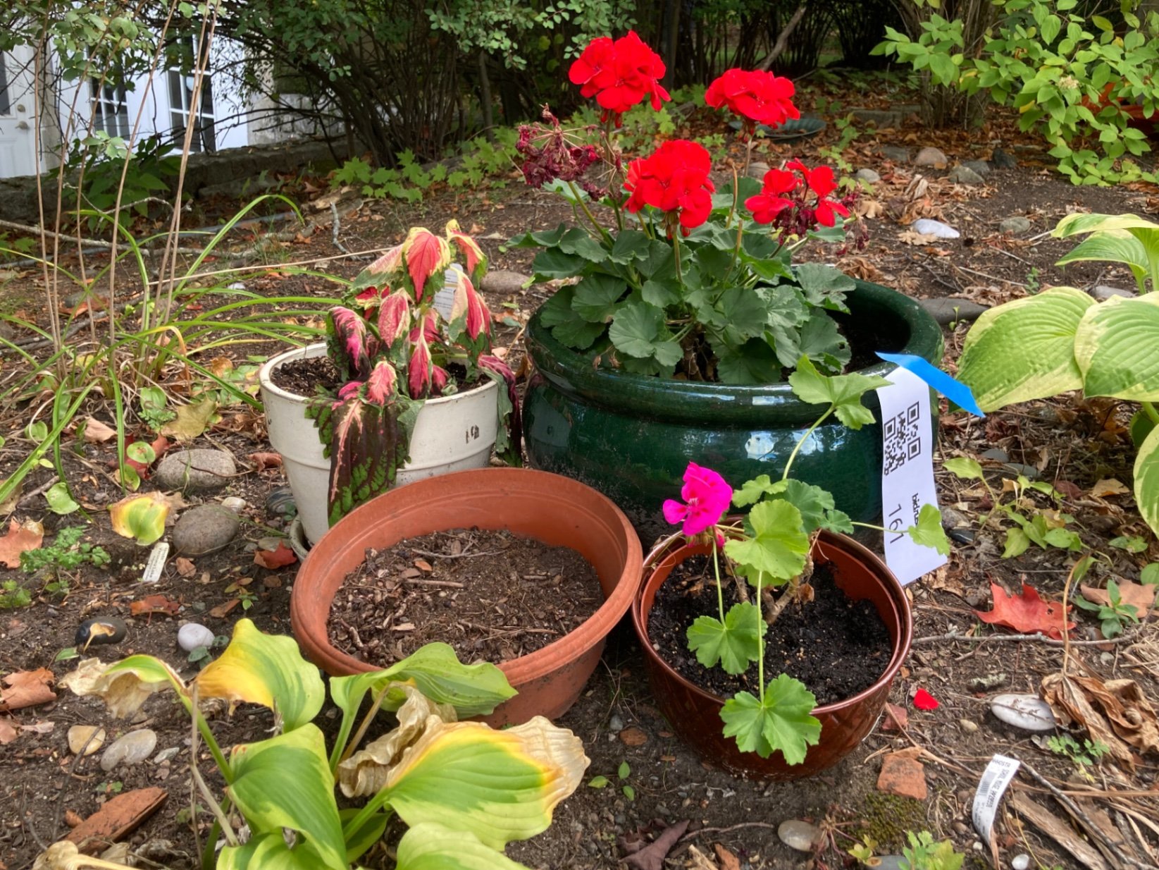 A group of potted plants and empty pots in a garden setting: red geraniums in a large green ceramic pot, a smaller plant in a plastic pot. Outer plants in good condition at time of cataloging