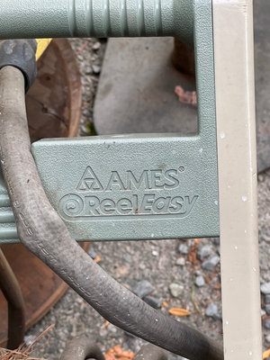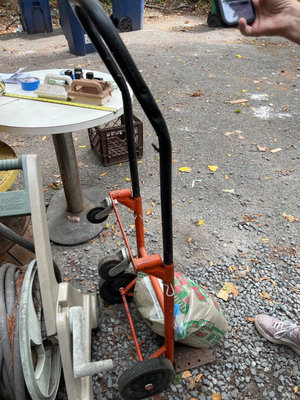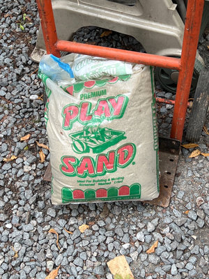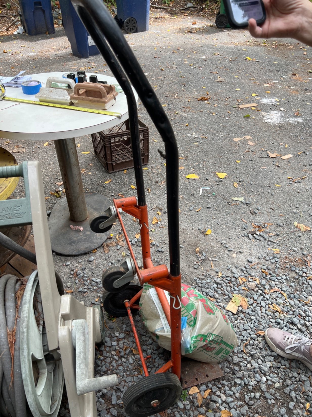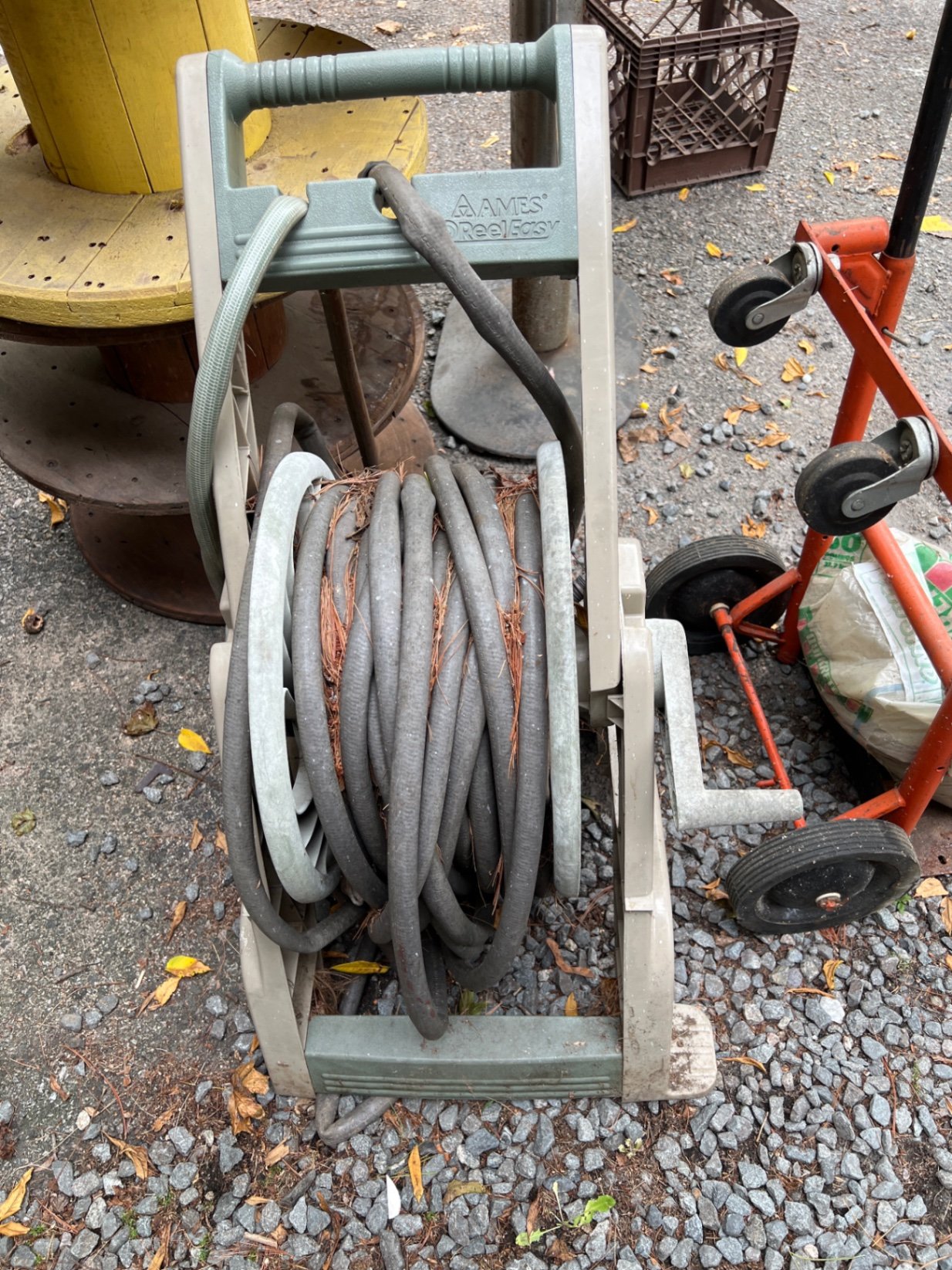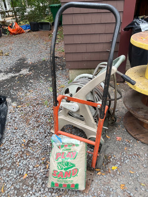A bag of premium Play Sand, an Ames Reel Easy hose reel with a coiled hose, and an orange two-wheeled hand truck. Located in garage