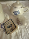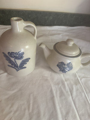 Cream-colored Yorktowne Stoneware jug and matching teapot with blue floral designs, 5& 7"