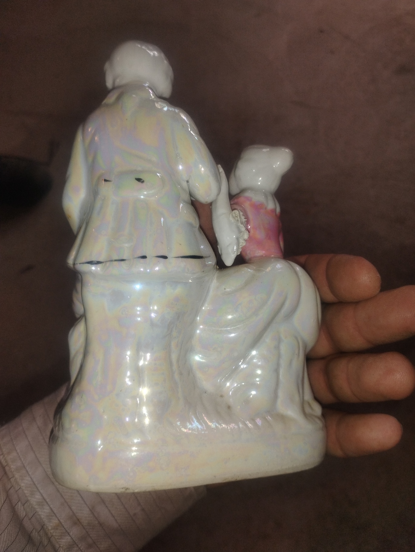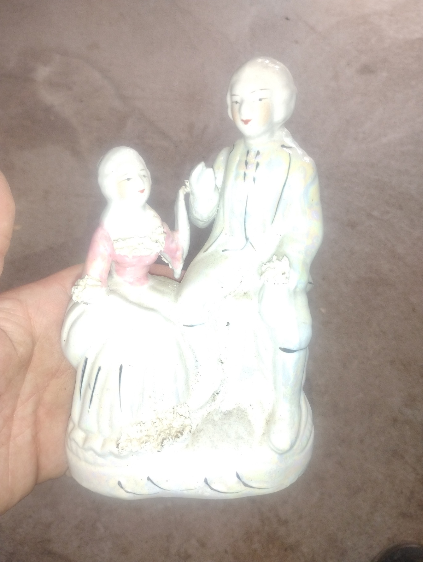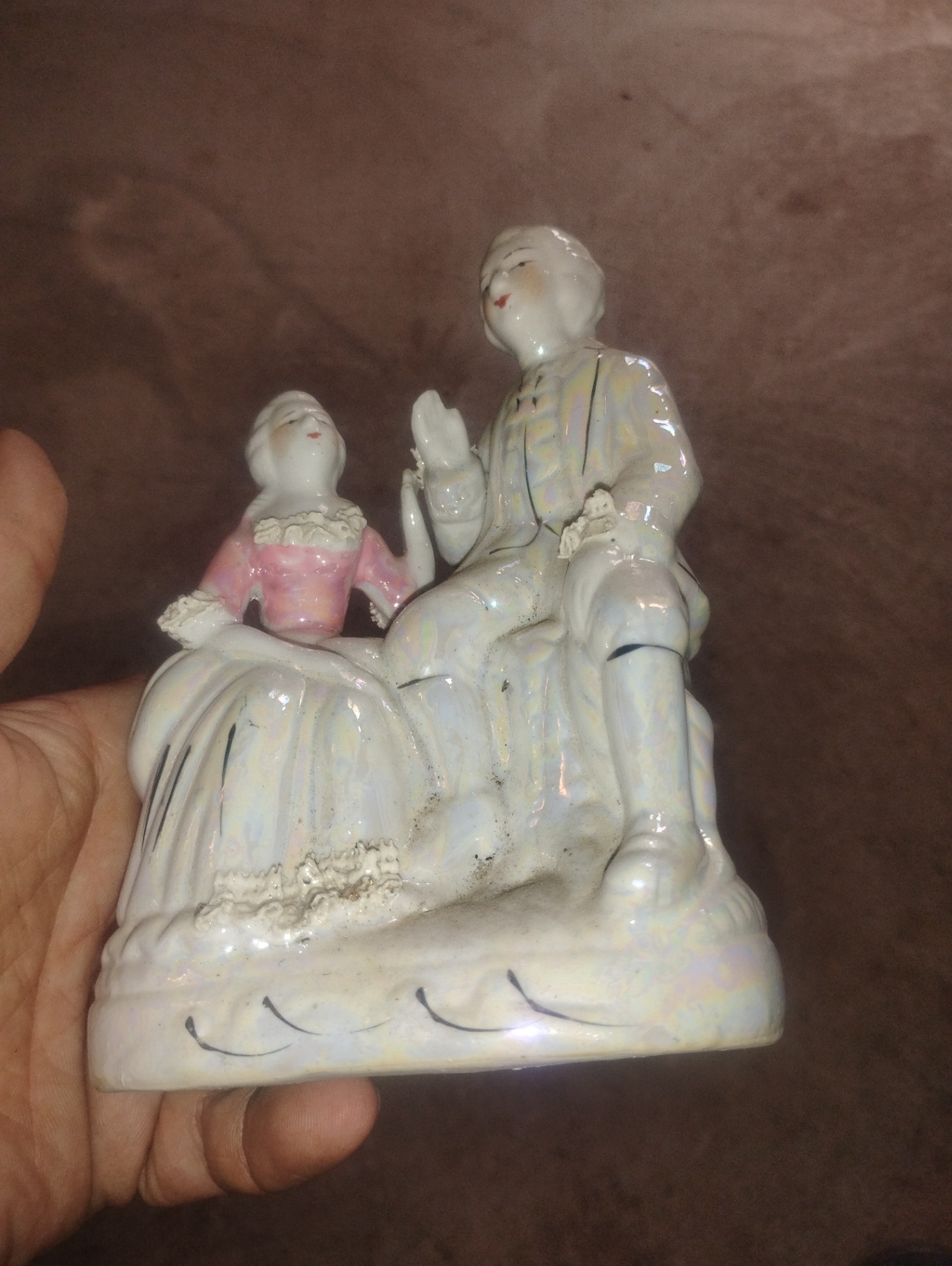 A porcelain figurine featuring a man and a woman in period clothing, with the woman in a pink dress and the man in a pale suit, posed together on a decorative base.