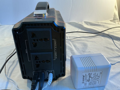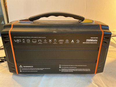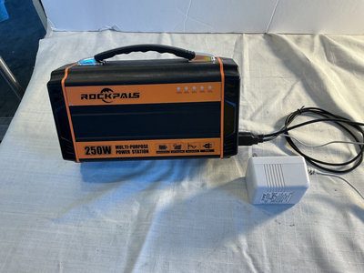 RockPals 250-watt portable power station with multiple AC and DC outputs, with a separate white wall charger. Tested for power.