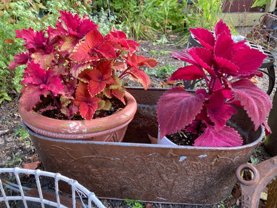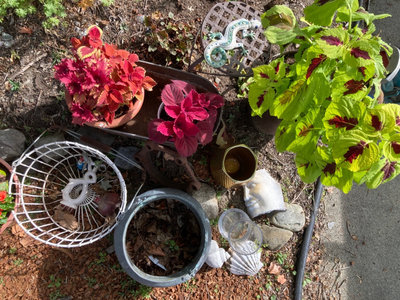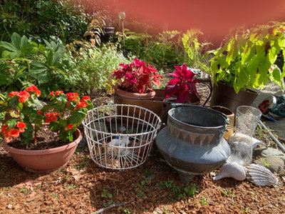 multiple potted plants with vibrant pink and red foliage in clay and metal containers, a large metal tub, a white wire plant basket, glass vases, seashells and stones, and a decorative gecko. Outdoor plants in good condition at time of cataloging.