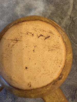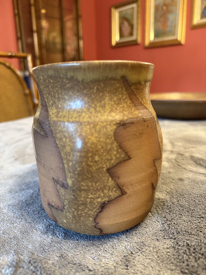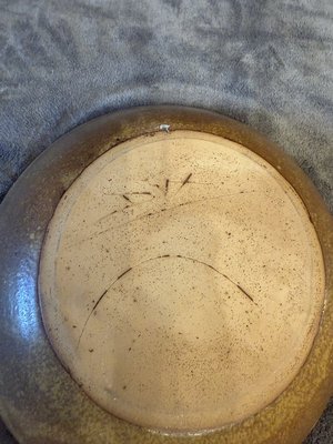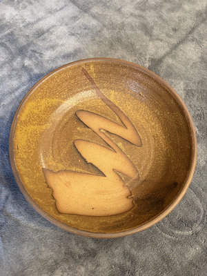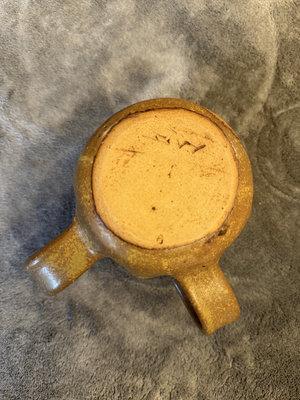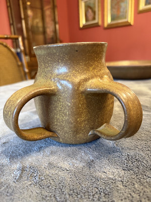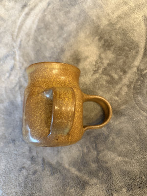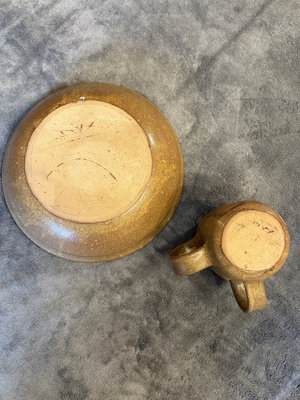 A two-piece pottery set consisting of an 11-inch diameter brown-glazed bowl and a 3.5-inch diameter, 5.5-inch tall dual-handled mug. Both pieces have a speckled earth-toned glaze; the mug features two loop handles and the bottoms show maker marks.