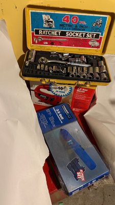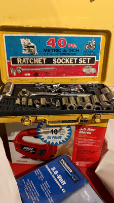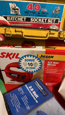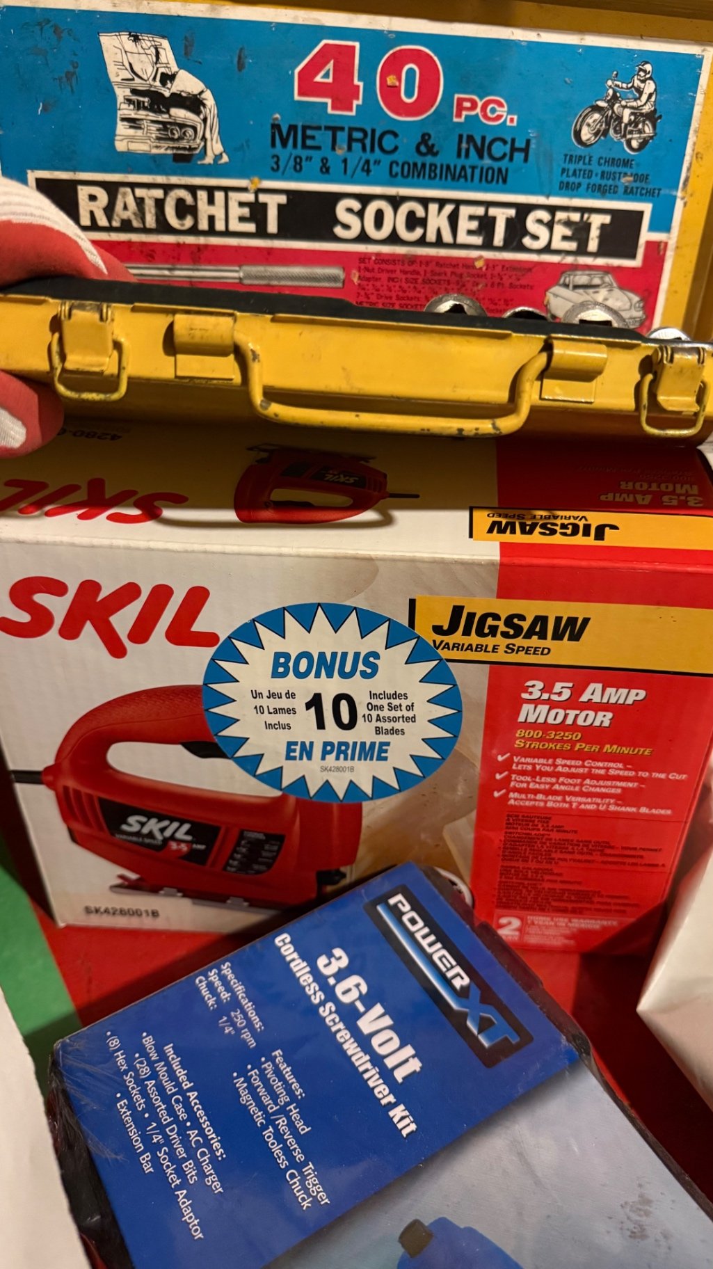 A collection of power tools and tool kits including a Power XT 3.6-volt cordless screwdriver kit, a 40-piece ratchet and socket set, and a Skil 3.5-amp motor jigsaw. ** BRING OWN PACKING MATERIALS. as is as found.