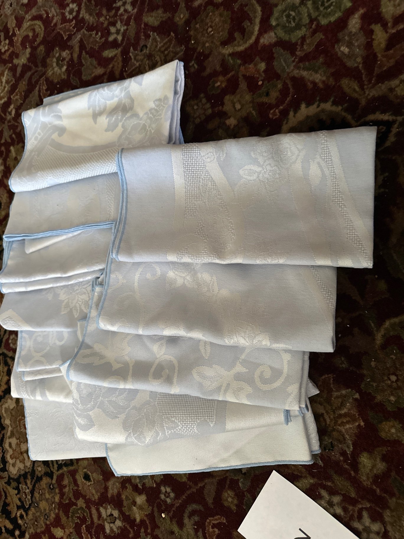A collection of light blue damask-patterned table linens with blue edging includes table cloth and twelve napkins. Kitchen linens.