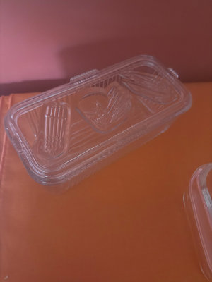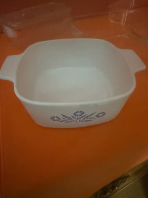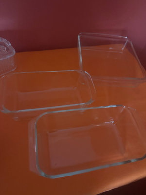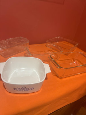 A white ceramic casserole dish with blue floral pattern and several clear glass rectangular bakeware dishes with lids, 81/2x81/2, 5x9, 4x8,
