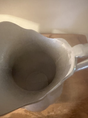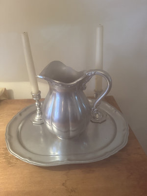 A set of silver-plated Queen Anne style items including a fluted 8" pitcher, an oval scalloped-edge tray 12x15 , and two matching candlesticks with tall white candles.