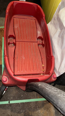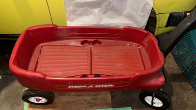 A red plastic Radio Flyer wagon with a long handle and four wheels. As is as found.