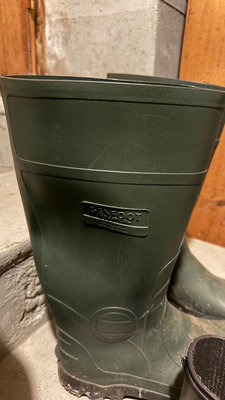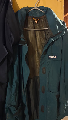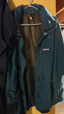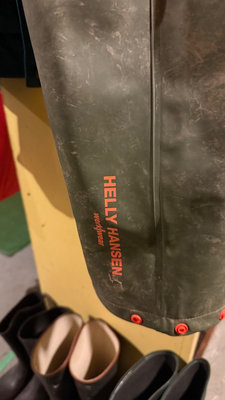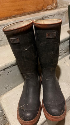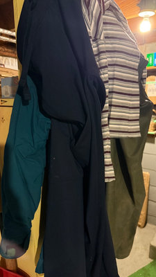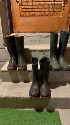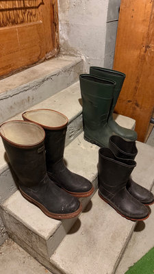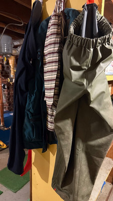 A collection of rubber rain boots (black and green size 6 and size 8) and various outerwear pants & jackets. Taiga jacket size M, Avia pant size M, Helly Hanson rubber pant size S, plus a striped shirt. **BRING OWN PACKING MATERIALS