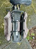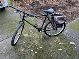 A black Raleigh M501 mountain bike with knobby tires, a rear rack carrying two gray pannier bags, a memory foam saddle cover, and a center kickstand.