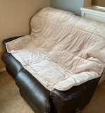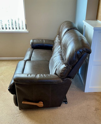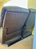 Brown 'leather' reclining loveseat, no label that I can find. Signs of wear but no tears that I can see. Measurements are 60 inches wide, 30 inches deep and 41 inches tall. Includes two tan throw pillows and a cozy throw blanket. This could be real leather but without a label, we can't say for sure.