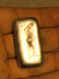 pewter A small, rectangular metal ingot with rounded corners; the front has an indistinct circular feature, while the back shows a rough, textured finish.