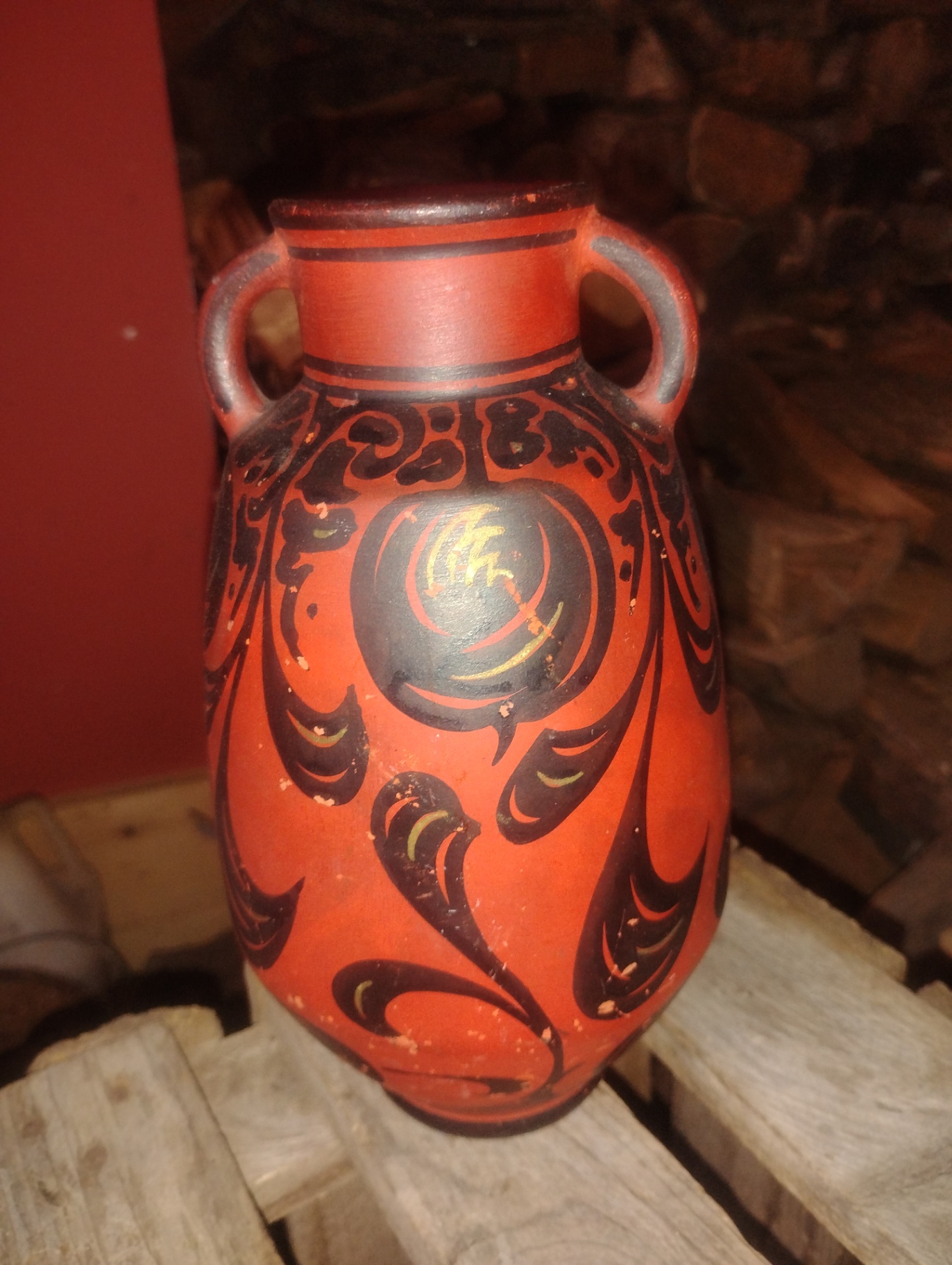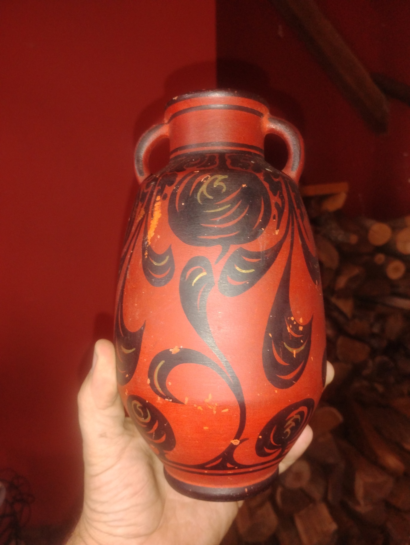A red ceramic vase featuring black scrolling floral patterns and two small handles at the neck.