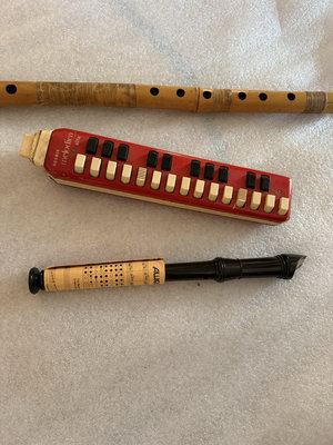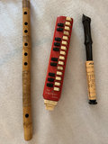 An assortment of wind instruments: a red Hohner melodica with keyboard, a wooden recorder with finger holes, and a black wind instrument