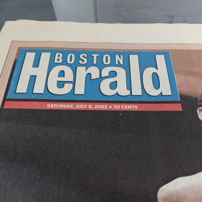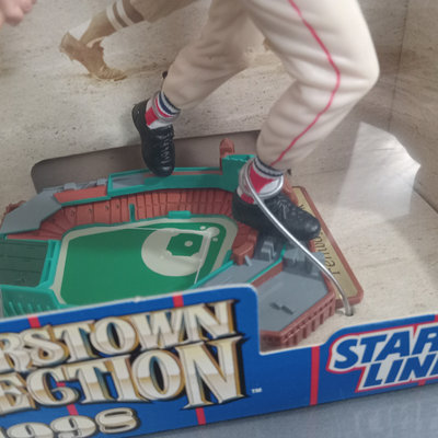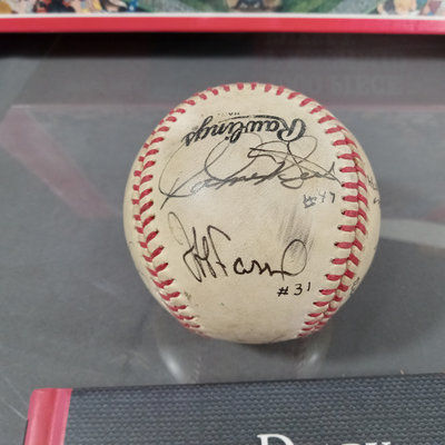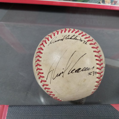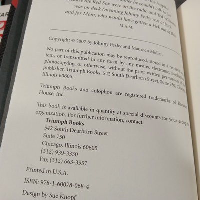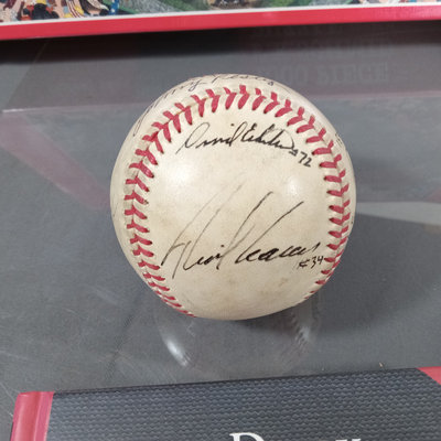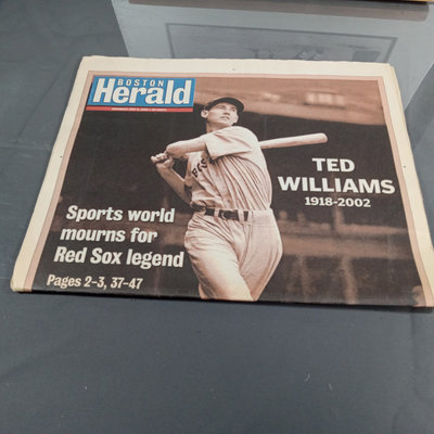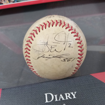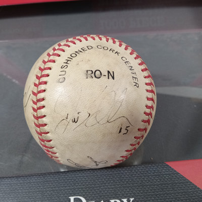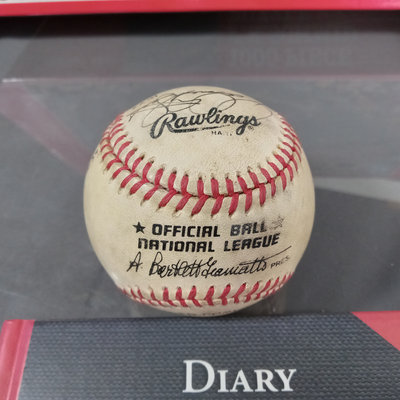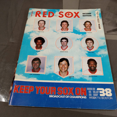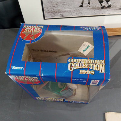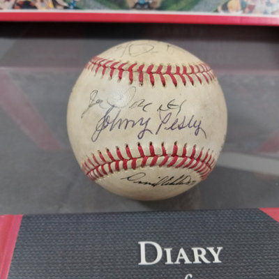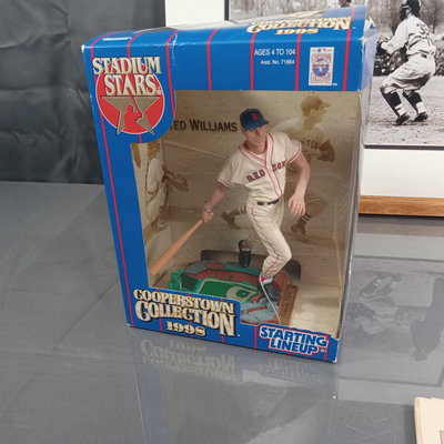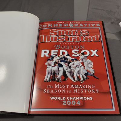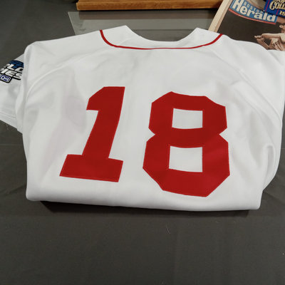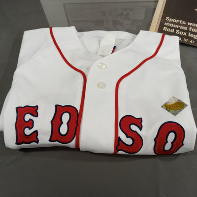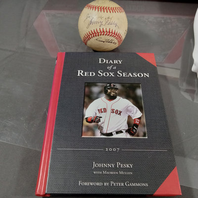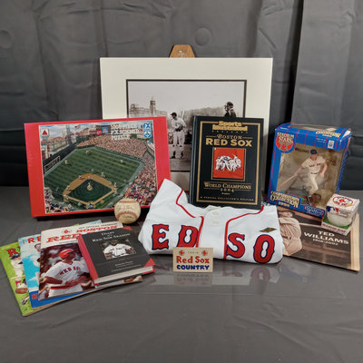For the Red Sox fan or budding collector. Diary of a Red Sox Season by Johnny Pesky and a Johnny Pesky signed Rawlings Official National League baseball manufactured 1987-1989, several other signatures illegible. Baseball soap in box. Vintage yearbooks. Sports Illustrated World Champions 2004 and Men's Large #18 official jersey with World Series 2004 patch on sleeve. Ted Williams figurine new in box and 1939 Grand Slam, Holy Cross matted print, 16x20. And more. 13 pieces.