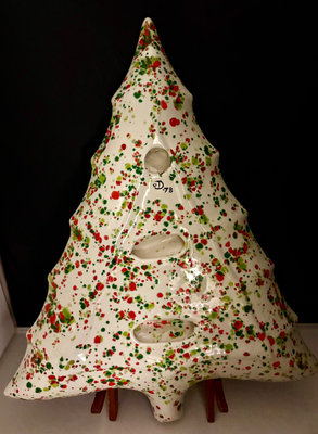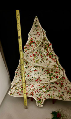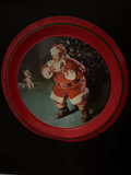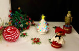 Beautiful collection of Christmas decorations. Coca Cola Santa tray from 1988, handmade ceramics mid century Christmas tree serving platters with speckled green and red flair , and holly candle holders. Colonial black metal candle holder with glass hurricane shade. Nutcracker trinket box, battery lighted mini ceramic Christmas tree and vintage lights .