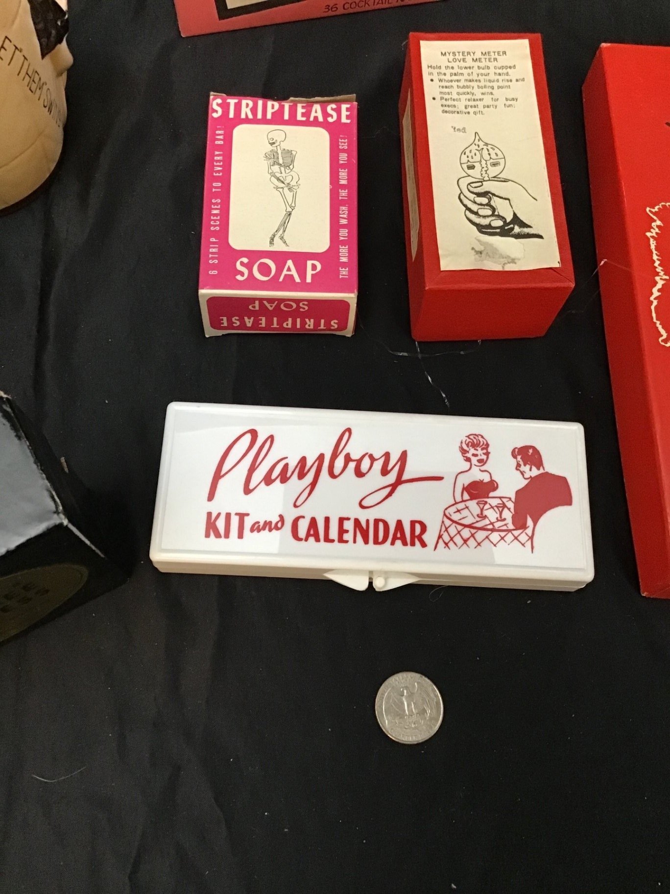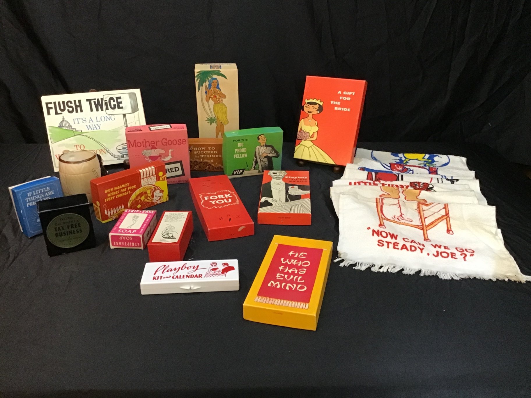 Vintage gag gifts from the 50s/60s. Includes gags in the box, censored cocktail napkins, tea towels, signage, mug. 25 pieces.