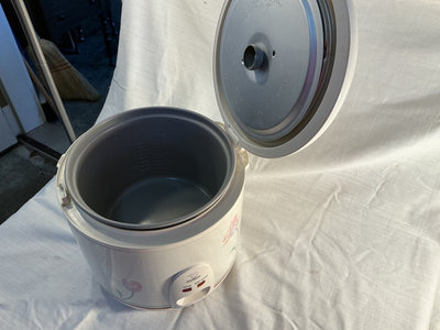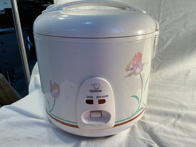 Zojirushi 10 cup rice cooker with floral pattern and four wooden spoons/spatulas of varying shapes.
