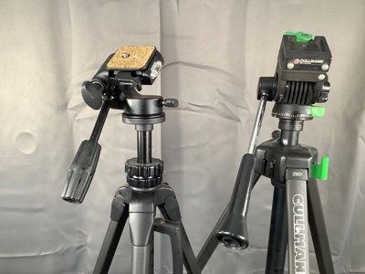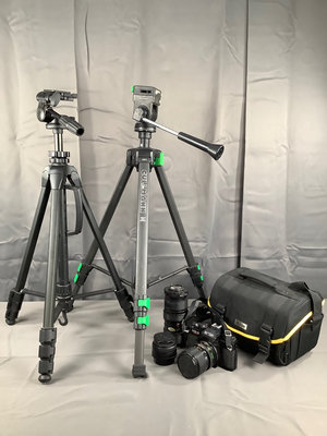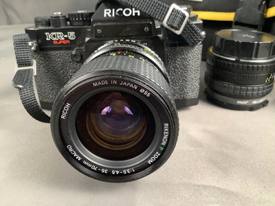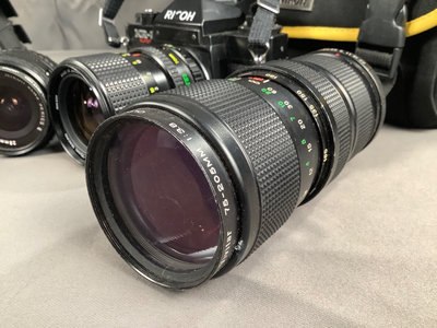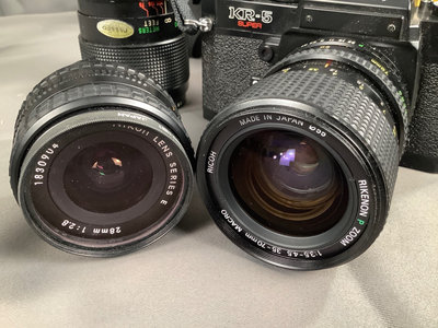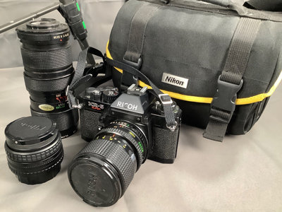 KR-5 super SLR camera body, with three lenses total, all worn. On camera, Ricoh 30-70mm lens. Nikon Series E 28mm lens with caps. Vivitar 70-205mm auto zoom, no caps, worn. Also included 1 2901 Cullmann tripod, and one Promaster 7150 tripod. Small Nikon camera bag. 7 pieces.