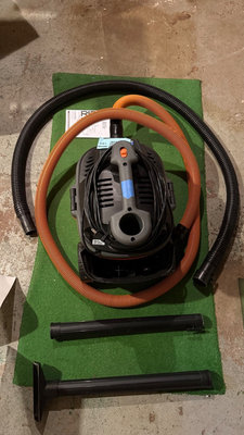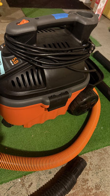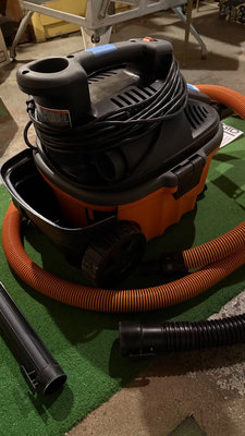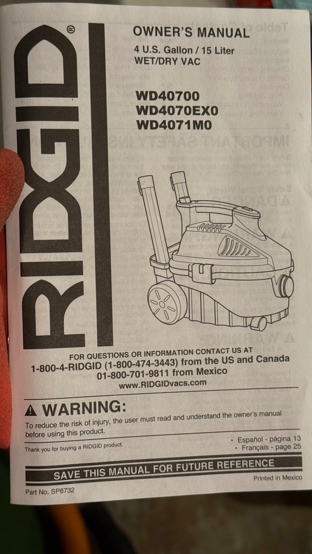 A RIDGID wet/dry shop vacuum with orange and black body, two long black extension wands, an orange corrugated intake hose, a black suction hose, and accompanying attachments, along with an owner's manual. UNTESTED