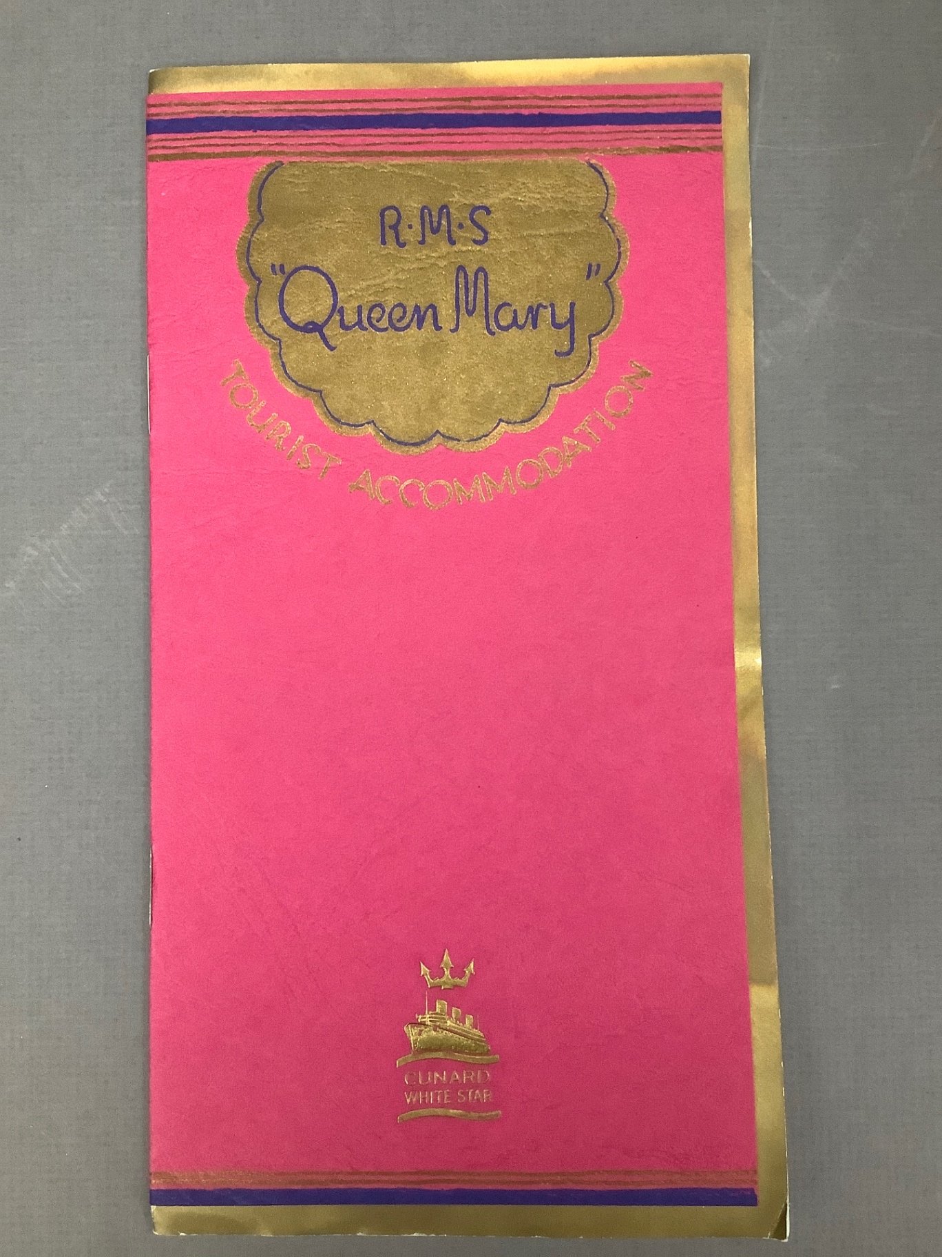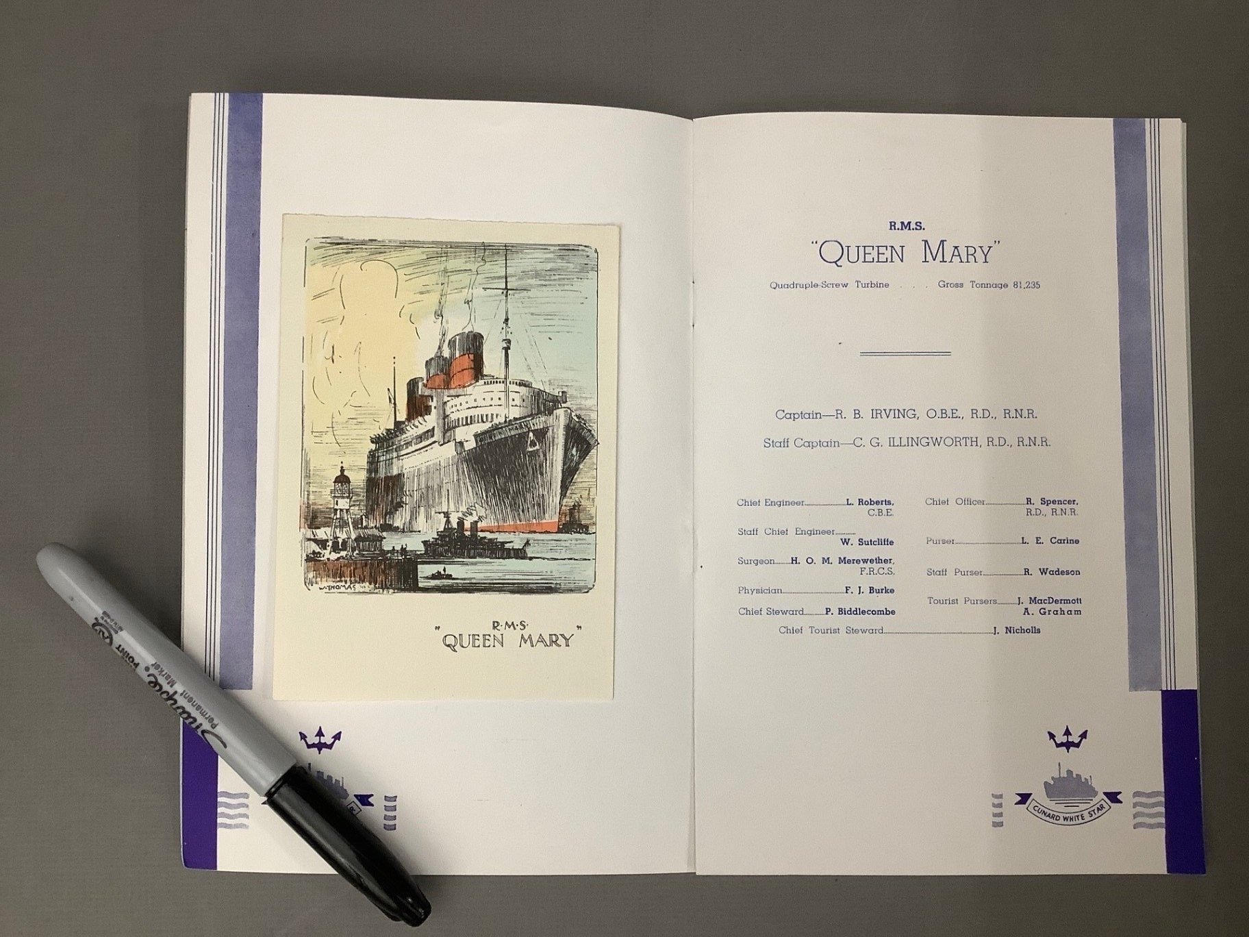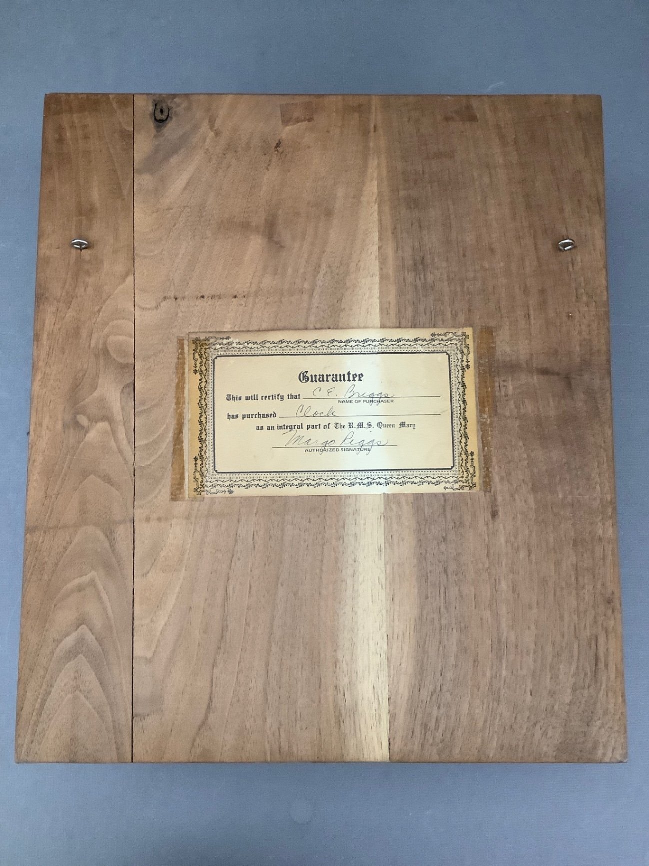 Original RMS Queen Mary brass ship’s clock with guarantee/ purchase information on back. Three brochures including tourist accommodation and two passenger lists from September 22, 1937. Smith Arstral clock piece measures 15x13x 6. Clock face 8d. 4 pieces.