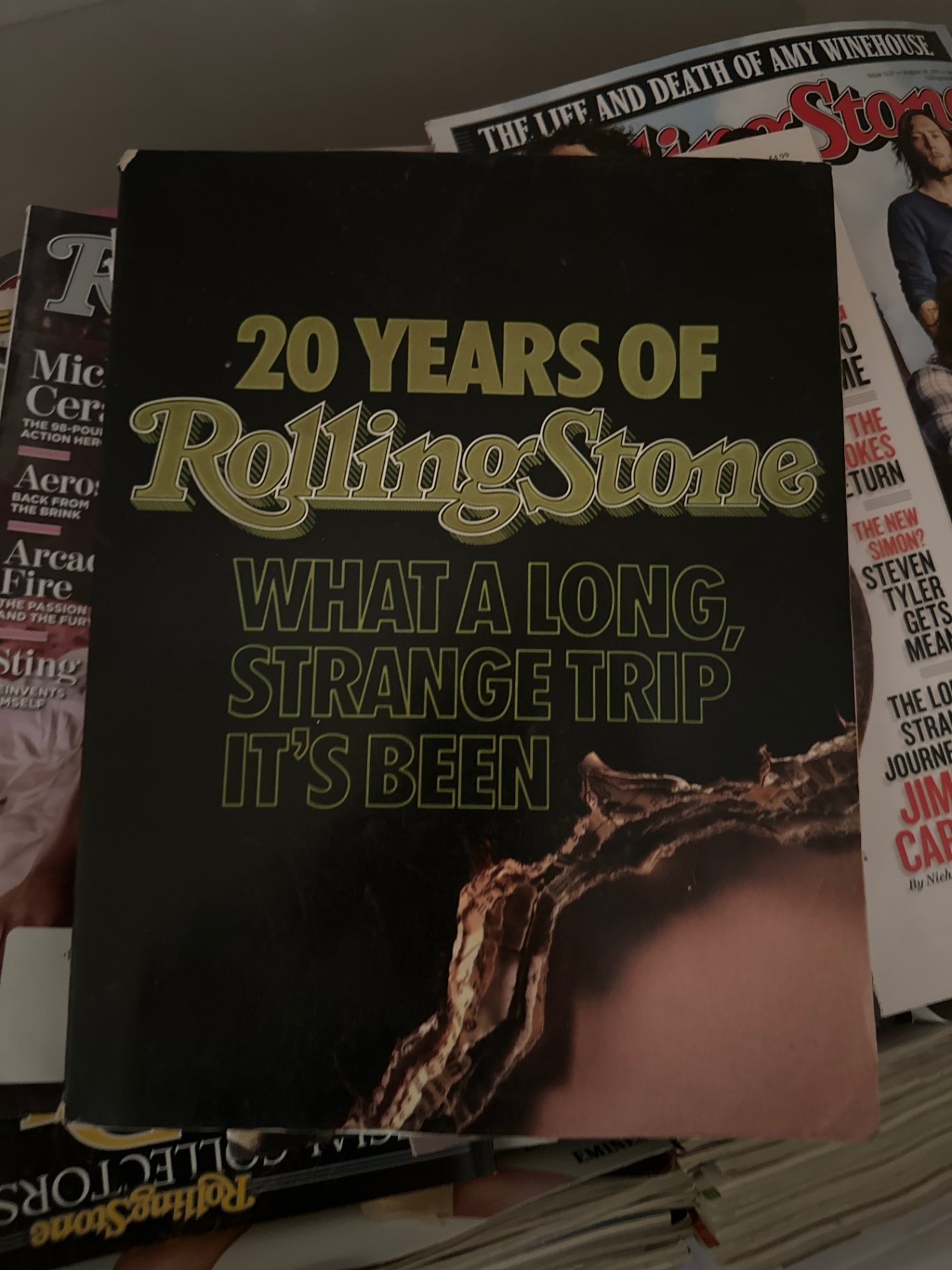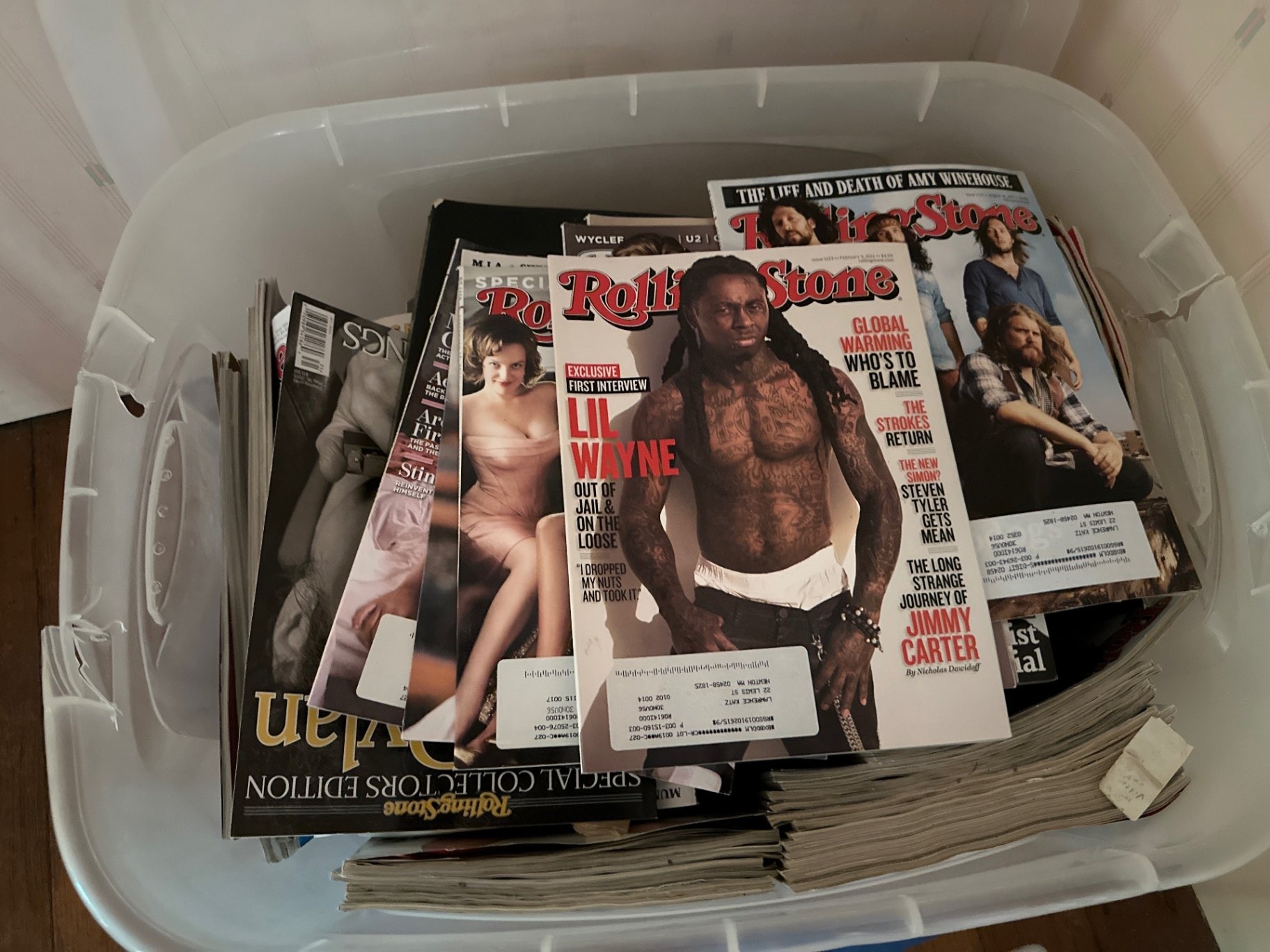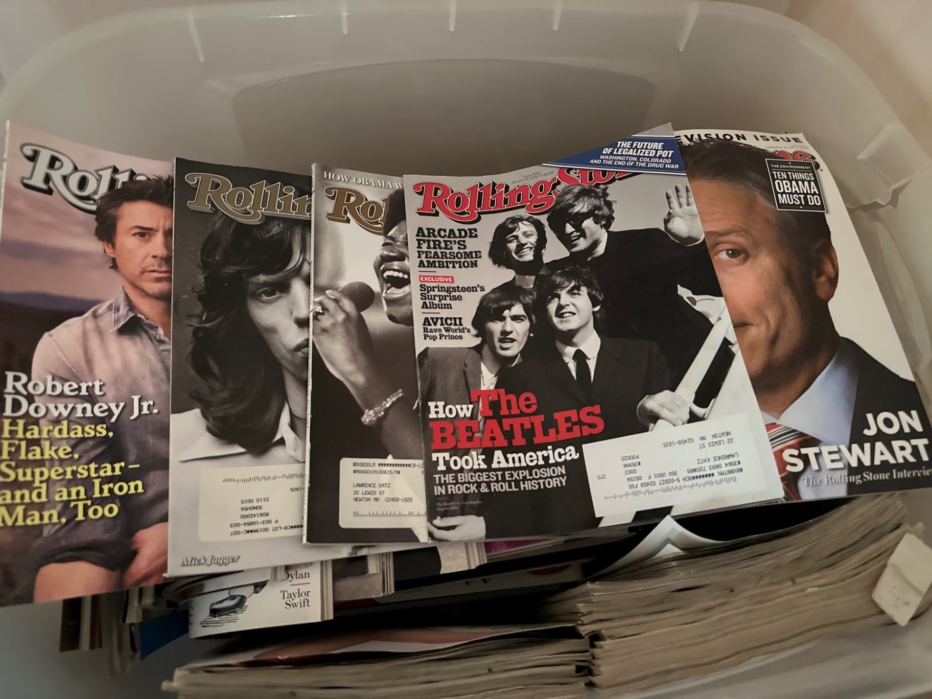 A plastic storage bin filled with numerous magazines and periodicals, including Rolling Stone issues and celebrity tabloids, stacked in multiple piles with various cover images and headlines. Even one showing the Beatles.