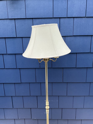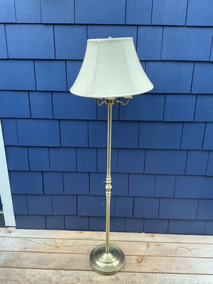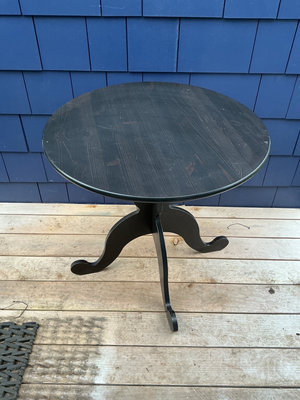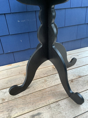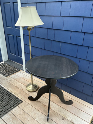 Round black pedestal table with curved legs 30 inches across and 28 inches tall. Brass four bulb candelabra style floor lamp 59 inches tall with a white fabric lampshade.