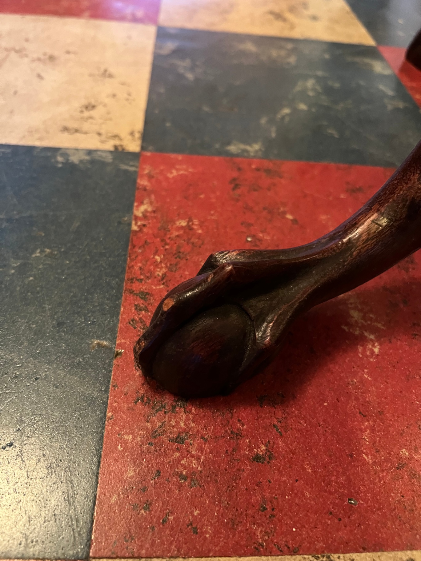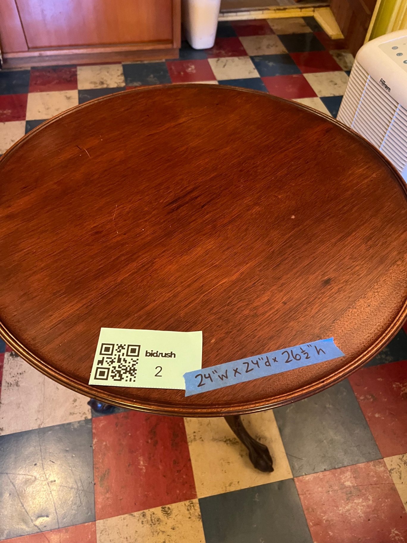 Mahogany tilt-top table with a turned central pedestal and three carved legs forming a tripod base. The top measures approximately 24 inches in diameter and the overall height is about 26.5 inches.